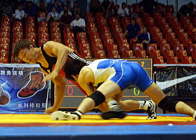 そして、松永には気持ちで負けることのない強さが備わっている。「どんなに実績のある選手であっても、名前負けしたことはありません」ときっぱり。2002年の世界学生選手権(カナダ)で優勝した時は、準決勝で前年の欧州王者だったチュルビア(前述)を破り、決勝で前年世界2位のババク・ヌルサド(イラン)を破っての優勝だった。今夏の結果といい、「名前負けしません」という言葉を証明してきたのであり、相手選手の過去の実績などものともしない強さを持っている(写真右=アジア選手権でマンスロフを攻める松永)。
