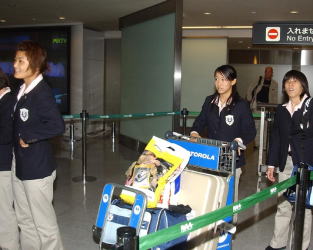 連勝記録を更新して帰国した吉田沙保里(右端)だが、スーツケースなしでゲートアウト。