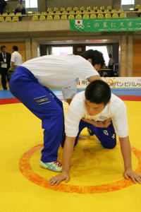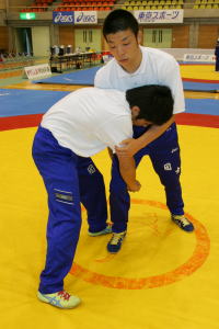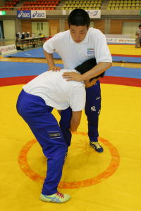 | (従来=×)従来よく見られたシーン。受ける側が脇を閉めたりして相手の攻撃をうまくカットして構える。 | (新=○)受ける側は手のひらを相手の背中に置く。もちろん、上から力を入れることは認められない。写真右はアジア・カデット選手権で見られたクリンチ・シーン。受ける選手(赤)の手の位置に注目。 | |