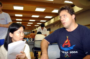 同行したドイツのヨハン・レバーマン・コーチ(ドイツチームの第2コーチ=写真右)は「日本のグレコローマンはミヤハラ(宮原厚次)とかいい選手を多く輩出してきた。こうして交流ができることは大変喜ばしいことだ。新しいルールをともに研究し、お互いに北京オリンピックでの勝利を目指して頑張りたい」と合宿の意義を説明。外国選手からみると日本の練習は長いとよく言われるが、「確かに米国やスウェーデンに比べれば練習量は多いかもしれないが、これがおかしいとは思わない。1日の2時間の練習を2回こなすのは普通だ。特に今回のドイツ・チームは若い選手が多く、違ったタイプの選手と多くの練習を積ませたい」と話した。