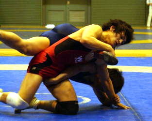 早大が1−2と劣勢だったが、74kg級で66kg級大学王者の佐藤吏(赤)が勝ち、