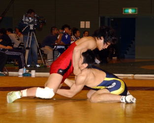 【一部リーグ決勝 早大−拓大】 66kg級:佐藤吏(早大)○[2−0(1-0,1-0)]●米満達弘(拓大) 拓大2勝1敗 早大は2年連続で66kg級全日本大学王者に輝いた佐藤(赤)に 試合の流れを戻すことを託した。