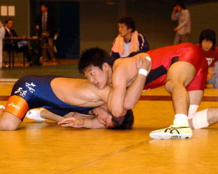【一部リーグ決勝 早大−拓大】 74kg級:大月葵斐(早大)○[2−0(2-0,1-0)]●清水泰隆(拓大) 2勝2敗 Aグループのリーグ戦を3階級にわたって6戦全勝だった早大期待のルーキー、 大月葵斐(赤)。早大の期待を背負ってマットへ上がった。