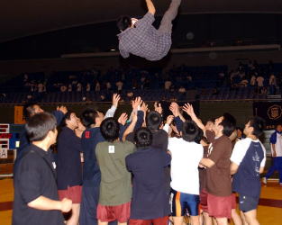 【一部リーグ決勝 早大−拓大】 拓大選手の胴上げ。最初に上げられたのは平井進吾コーチ。 昨年の7位転落の時、責任を感じて大粒の涙を流した男だ。 この1年間、汚名返上をかけて全力を尽くした。