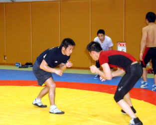 コーチとして練習に参加したアテネ五輪銅メダリストの田南部力(左)は