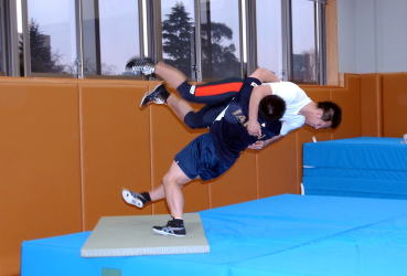 スポンジマットの上で練習する松本慎吾。