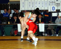昨夏のインターハイでは、さすがに高校レスリングの壁を感じた。技術では、全国中学選手権3連覇(写真左は03年全国中学生選手権)の選手だけに引けを取らなかったようだが、「基礎体力がかなわなかった。精神的にも負けていた」という。1年間でその壁を克服して全国制覇。「インターハイは無失点で優勝する」と目標を明確に定め、さらに一段高い壁に挑もうとしている。