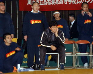 団体戦決勝 霞ヶ浦(茨城)○[6−1]●玉名工(熊本) “指定席”とも言える決勝のマットだが、霞ヶ浦・大沢監督は厳しい表情。