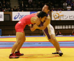 追う立場にあった選手が、あっという間に追われる立場へ。勝負の世界の新旧交代は川の流れのように止まることを知らない。グレコローマン74kg級の菅太一(警視庁)も、昨年暮れ、勝負の世界のこの厳しさを痛感した一人だ。アテネ五輪前までは永田克彦のが城を崩す一番手の立場にいて、追う立場だったのが、20歳の鶴巻宰(国士大)の台頭により、今年は自分の立場を守ることに全精力を傾けなければならなくなった。(写真左:全日本選手権決勝で鶴巻に苦杯を喫した菅=右)