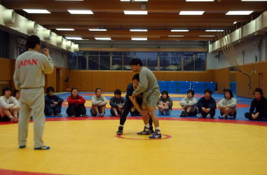 ヤリギン国際大会に行った藤川健治コーチ(左)の指導のもと、クリンチの講習。