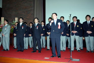 富山英明監督があいさつ。右後方には、(左から)土方政和、赤石光生、金浜良コーチが並ぶ。 4人ともアテネ五輪のコーチ(赤石コーチはアフガニスタンのコーチ)。 すごいコーチング・スタッフだ!