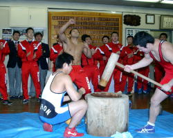 磯川に先を越されたことで焦ることはない。しかし前進をやめてしまえば置いてきぼりにされるのがこの世界。高校時代の強豪が、そのまま世界で通じる選手になっていないことは、これまでの歴史が証明している。高校時代の実績におごることなく、一歩一歩、世界のトップへの道を歩んでほしい。(写真右は、今年1月9日の日大もちつき大会。向こう側で裸で踊っているのが松本)
