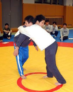 右側の選手がコイントスの勝者。クリンチを組んでしまえば、