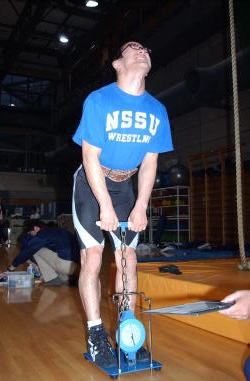 背筋力の測定。ナンバーワンはグレコ66kg級の飯室雅規選手の227kg。 以下、グレコ84kg級・松本慎吾選手の221kg、フリー96kg級の小平清貴選手の209kg、 グレコ74kg級・鶴巻宰選手の207kgと続いた。