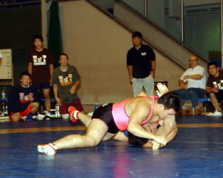 勝負となった120kg級。畑俊輔(赤)が体格差のハンディをはね返し、