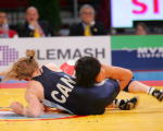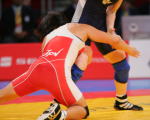 | 相手の頭を下げた坂本。相手が嫌がって頭を上げると、脚へタックル。 | 相手の体を宙へ浮かす勢いでテークダウンへ。 | 1点を取るだけでは終わらず、一気にフォールを狙う。 | |||