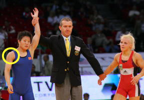 女子48kg級決勝は、アテネ五輪金メダリストのイリナ・メルニク(ウクライナ)が攻勢に試合を進めながら、第2ピリオド、巻き投げを失敗して押さえ込まれ、そのままフォールされた。その時、メルニクはフォールから逃れるため、相手の任層雪(中国)に噛みついてしまったが、任雪層の肩にはその時の歯型がくっきりと残されていた。