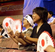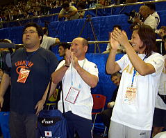 表彰台のほぼ真後ろの応援席で、わが子が聞かせてくれる日本の国歌を喜ぶ団体がいた。28日に総勢15人で広州入りした親族を含めた応援団だ。女子フリースタイル48kg級の決勝が始まると、総立ちになって「千春―! 千春―!」と絶叫。開始直後に相手から攻められると「大丈夫、大丈夫。そっから、そっから」と応援を続けた。