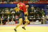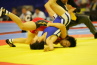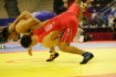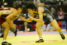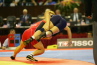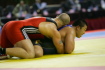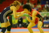 《1P》お互いに警戒し、決め手がない。伊調が1分20秒ころ、正面タックルから体を浴びせてあわやのシーンをつくったが、ぎりぎりのところでこらえられる。このあと、がぶったところを、任雪層が飛行機投げ気味に下からのがぶり返しを狙ったが、伊調がこれをこらえ、そのまま押さえ込んでフォールを決めた。