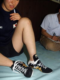 夏も、リハビリのため東京(国立スポーツ科学センター)と中京女大のある愛知・大府市を往復する日々。1人の孤独な戦いを続けた(右写真=左足手術の痕を見せる坂本)。8月に入ると足のボルトも抜け、やっとマットで練習するところまできた。万全に仕上げて世界選手権に出たい、という気持ち一心で練習を始めた。