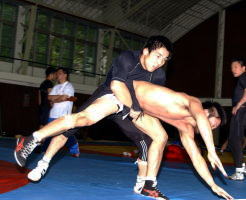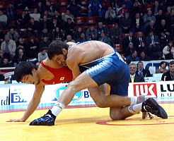 気持ちの高まりを表すのが、世界V8(五輪2度を含む)の絶対王者、ブバイサ・サイキエフ(ロシア)と闘いたいという思いだ。01年7月の「ヤリギン国際大会」(ロシア)と同年の世界選手権(下写真)で闘ったものの、その後、対戦する機会がない。「あれから5年。自分がどれだけ強くなったかを試すためにも、闘ってみたいです」と、世界一の選手との対戦を熱望する。