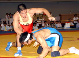 全国高等学校総合体育大会(インターハイ)レスリング競技最終日は8月5日、大阪・岸和田市総合体育館で個人戦決勝までが行われ、84kg級の永田裕城(京都・網野、左写真)が昨年の74kg級に続いて2年連続優勝。3月の全国高校選抜大会に続いて春夏制覇も2年連続で達成し、最優秀選手に輝いた。