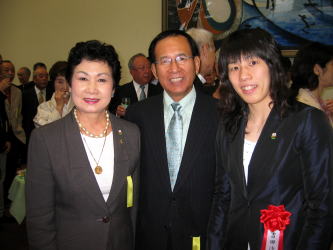 | 荒川静香(前列右端)ら受賞者勢ぞろい。前列右から2番目はJOCの竹田恒和会長。 | 日本協会の福田富昭会長、全日本女子連盟の小野清子会長とともに。 |