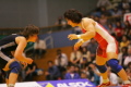 《1P》新海は開始直後、右脚へタックルにいったが、押さえられ0ポイント。しかし中盤、2度目の片足タックルで横転させ2−0へ。終了間際、相手のタックルをつぶして1点を加え3−0とした。