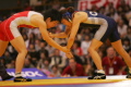 《1P》なかなかポイントの取れなし試合は、後半、伊調がタックル。相手にがぶられ、がぶり返しをこらえる展開となったが、じりじりと自分有利の体勢にした伊調がバックを取り、ニアフォールへつなげて4−0。このピリオドを取った。