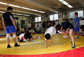 部員が30人以上いるにもかかわらず、道場はマット1面という厳しい環境(下写真)。そんな中、量をこなし、苦しいまでの練習に