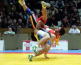 《1P》コイントスで鶴巻が先攻。俵の体勢で持ち上げるが、相手が足をかけたということで鶴巻が2ポイント獲得。中央に戻り、ローリングで1ポイント獲得し、すかさず押し出してもう1ポイント追加。グルジアの攻撃では、鶴巻がうまく立ち、相手のバックをとって1ポイント獲得。そのまま相手の体を少し返して2ポイント追加。相手にポイントはなく、守りの鶴巻に1ポイント入って8−0。