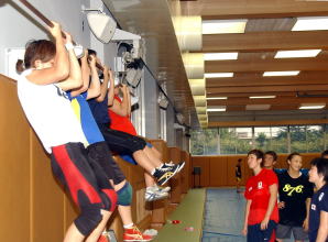 辛かったのはマットに上がれるようになったあと、ひざと肩の負傷が癒えていながら、ブランクのせいか体が思うように動かないというギャップに直面した時だったという。負傷が治っているのかどうかは、はっきりした数字に出るものではないから、その意味での不安との闘いもあったはずだ。医師のお墨付きをもらっても、自分の体のことは他人には分からない。それらの困難を乗り越え、正田にリベンジしてつかんだ栄冠。「うれしいです」と、半月がたった今も笑みが浮かぶ。(写真右:マットに上がれるめどがついた昨年9月、全日本合宿に参加した山本=右から2人目)