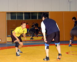 1月5日から東京・国立スポーツ科学センターで行われている世界合宿でも、外国選手と久しぶりに手合わせした感触うんぬん以前に、「ウォーミングアップでばててしまっていますから…」と、全盛期の体力に程遠い現状を痛感している。体力を元に戻さなければ、ワンマッチに勝つことはできても、1日に最大で6試合をこなさなければ優勝できない世界選手権を勝ち抜けるはずがない。(写真左:55kg級世界2位の蘇麗慧=中国=と闘う山本)
