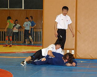世界一を奪還した坂本日登美のスパーリングを見守る藤川コーチ。