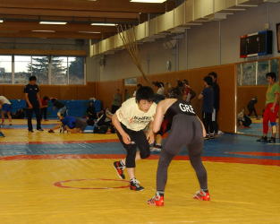世界一奪還を目指す伊調千春もドイツ選手と熱の入った練習。