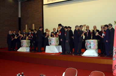 鏡開きで3つの樽が開けられた。