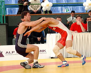 【55kg級 田岡秀規(自衛隊)】 準決勝 ●[1−2(0-1,6-2,0-2)] Dilshod Mansurov(ウズベキスタン) 勝負の第3ピリオド。田岡の猛攻にマンスロフの足がもつれた…。あと一歩だった。