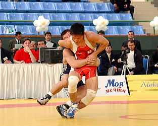 【55kg級 田岡秀規(自衛隊)】 準決勝 ●[1−2(0-1,6-2,0-2)] Dilshod Mansurov(ウズベキスタン) ややバテてしまった田岡。ラスト30秒、マンスロフに背後に回られてしまった。