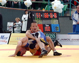 【66kg級 藤本浩平(拓大)】 敗者復活戦 ●[1−2(5-3,0-1=0:05,0-1)] David Nozadze(グルジア) 相手のしつこいグラウンド攻撃をこらえる藤本。