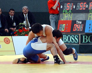 【55kg級 稲葉泰弘(専大)】 敗者復活戦 ○[2−0(@Last-1,2-1)] Namik Sevdimov(アゼルバイジャン) 第1ピリオド前半、タックルを受けて場外へ出てしまった稲葉。0−1。