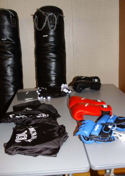PRIDEから寄贈されたサンドバッグやグローブ。