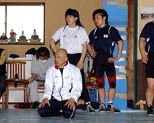 地元開催のW杯に張り切る栄和人監督と吉田沙保里(左)、伊調千春(右)。