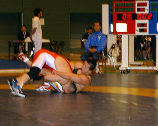 【Bグループ6回戦 日体大(赤)−専大(青)】 日体大はチームスコア3−2ながら、120kg級に強敵を控えており落とせない状況。 96kg級の桜井紀宏(日体大)がラスト2秒、逆転で勝ち、日体大に勝利を呼んだ。