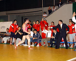 【Aグループ7回戦 拓大(赤)−日大(青=シングレットはピンク)】