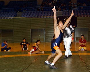 《決勝:早大(赤)−拓大(青)》 【74kg級】桜井浩二○[2−0(1-0,1-0)]●大月葵斐(早大) チームスコア3−1として主将・磯川につないだ桜井は派手なパフォーマンス。