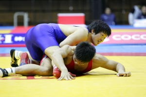 決勝に勝ち上がってきた鶴巻宰(自衛隊)は半年前の選抜選手権で苦杯を喫した相手。この敗北で世界選手権代表の座も奪われてしまった。その鶴巻との試合は一進一退そのもの。差し出争いから両者ともポイントが奪えない。グラウンドの攻防は1−1のラストポイントで岩崎が第1ピリオドを取ると、第2ピリオドも第1ピリオドと同じ展開へ。やはり1−1ながらもラストポイントで岩崎が取り、2年ぶりの優勝を飾った(左写真=鶴巻との接戦を制して王者に返り咲いた岩崎)。