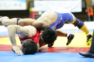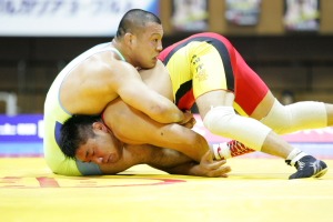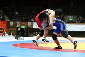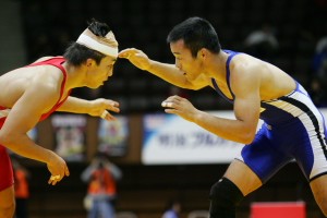 男子グレコローマン55kg級は長谷川恒平(福一漁業=左写真)がアテネ五輪代表の豊田雅俊(警視庁)を破って初優勝。青山学院大出身選手として初めて全日本チャンピオンに輝いた。