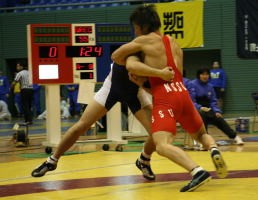 安達巧監督は「まだまだ荒削りだから」と発展途上を強調するが、伸びしろいっぱいで、来年は今年以上に主力としての活躍が期待される。「来年は84s級でレギュラーを獲りたい」と“門間先輩”との84s級の正規メンバー争いも楽しみだ(左写真:新人戦のグレコローマンで闘う松本=赤が松本)。