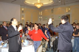 | 富山英明・強化委員長の乾杯でパーティーがスタート。 | 盛り上げの先陣を切った日本チーム。 |