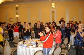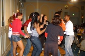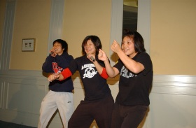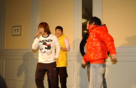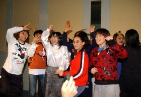 | スペイン語のカラオケはなかったので、ベネズエラ・チームはダンスを披露。 | 最後は小ステージ上でディスコ大会へ。 | 栄ヘッドコーチの三本締めで終了。外国選手も真似てくれました。 |